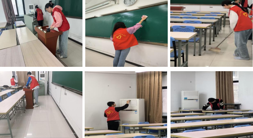 活動于每日17:50正式開始,志愿者們分組進入各個教室進行打掃,并由我院學(xué)生會志愿團成員組織在對應(yīng)教室簽到簽退在教室室大掃除中,志愿者們不怕苦,不怕累,不怕臟,認真做好清掃地面、擦拭桌椅、整理教具清潔空調(diào)、整理衛(wèi)生死角等每個細節(jié)工作確保教室內(nèi)外環(huán)境的干凈整潔。在一番熱火朝天的努力下,打掃活動拉下了帷幕志愿者們將教室打掃得窗明幾凈。