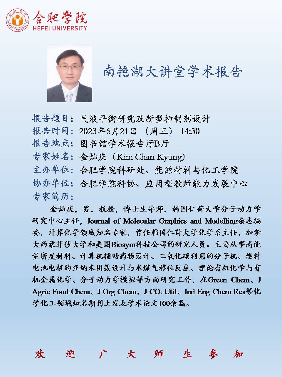 【學術報告預告】本周三下午舉行韓國仁荷大學金燦慶教授題為“氣液平衡研究及新型抑制劑設計”學術報告(材化學院承辦)