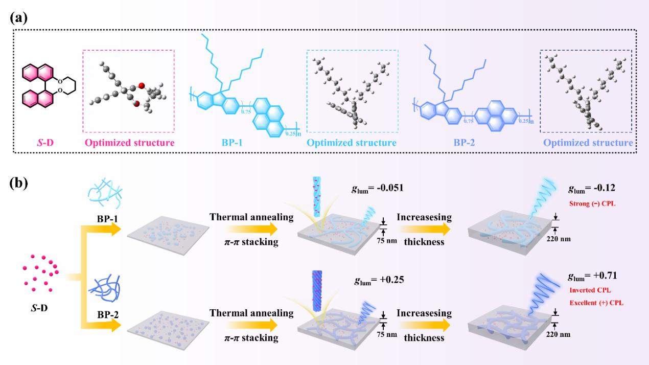 圓偏振發光(CPL)材料在三維成像、光學信息存儲、不對稱合成等方面頗具應用潛力,在手性科學研究中具有重要意義。手性組分在氫鍵、靜電相互作用及π-π堆積等相互作用的協同下,可以組裝成各種各樣的手性結構,表現出獨特的CPL性質。目前大多數CPL材料的不對稱因子(glum)值低于10-2數量級,如何提高glum值以及如何實現手性轉移、傳遞和放大成為當前CPL研究亟需解決的最關鍵科學問題之一。為解決這一難題,近日,合肥大學能源材料與化工學院青年教師耿中興及其合作者在高glum值CPL材料的構筑和性能提升研究方面取得了系列新進展。研究人員創新性地采用兩種不同取代位點的非手性芘基主鏈聚合物(BP-1和BP-2) (BP-1的芘環為1,6位,BP-2的芘環為2,7位)作為CPL發射體與一種帶有橋接烷基鏈的手性聯萘誘導劑(S/R-D),通過分子間手性誘導機制構建螺旋手性共組裝體。有趣的是,與S/R-D-BP-1相比,經過熱退火處理的手性共組裝體S/R-D-BP-2可以發出反轉和放大的CPL信號。最佳質量摻雜比的手性共組裝體(S/R-D)0.2-(BP-2)0.8旋涂薄膜的最大|glum|值在220 nm厚度下高達0.71 (λem = 428 nm, QY = 44.8%),約為(S/R-D)0.1-(BP-1)0.9(|glum| = 0.12,λem = 451 nm, QY = 37.6%)的6倍。值得強調的是,在分子間π-π堆疊相互作用驅動的手性共組裝芘基CPL材料中,最大|glum|值高達0.71是迄今為止報道的最高值之一。實驗和理論分析結果表明反轉CPL信號可歸因于手性共組裝過程中分子間π-π堆疊相互作用驅動的不同共組裝模式導致螺旋納米纖維方向相反。本研究為基于非手性芘基主鏈聚合物結構-活性調節手性共組裝發射體的CPL發射行為提供了一種有效的新方法。該工作近期在高分子學科權威性學術期刊Macromolecules發表(doi.org/10.1021/acs.macromol.4c00153)。