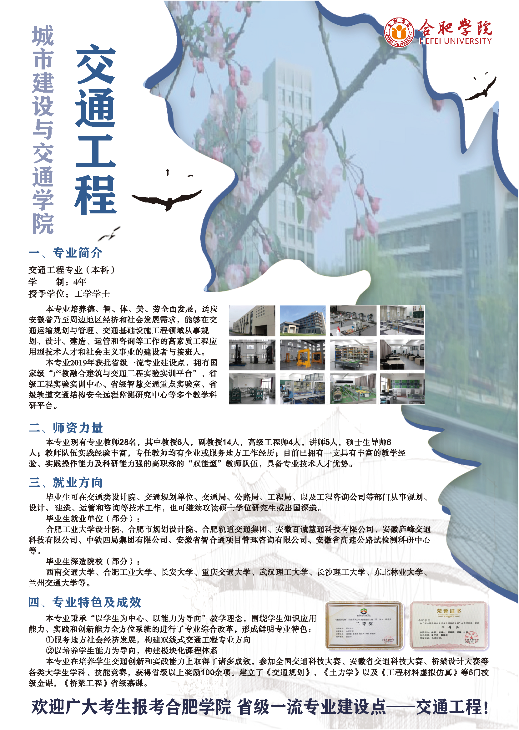 本專業培養德、智、體、美、勞全面發展,適應安徽省乃至周邊地區經濟和社會發展需求,能夠在交通運輸規劃與管理、交通基礎設施工程領域從事規劃、設計、建造、運管和咨詢等工作的高素質工程應用型技術人才和社會主義事業的建設者與接班人。