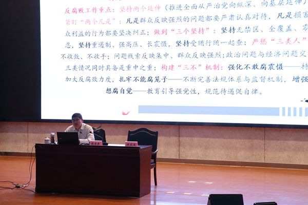 魏常年介紹了十八大以來我國反腐敗斗爭的形勢、任務與取得的成效。他指出,反對腐敗,建設廉潔政治,是中國共產黨一貫堅持的鮮明政治立場,是人民關注的重大政治問題。十八大以來,經過全黨的共同努力,反腐工作已取得重大成效,黨的各級組織管黨治黨主體責任明顯增強,中央八項規定精神得到堅決落實,黨的紀律建設全面加強,反腐敗斗爭壓倒性態勢已經形成并鞏固發展。但總體來說反腐形勢依然嚴峻復雜,反腐工作要持續有效的開展,要更加有效地遏制增量,更加有力地削減存量。