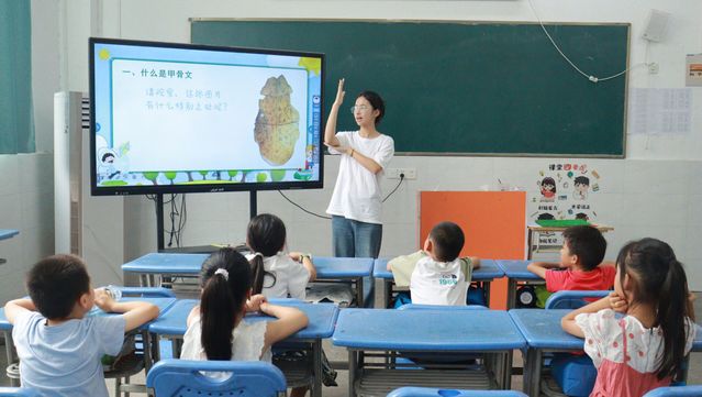“什么是甲骨文?”課堂伊始,教師首先給同學(xué)們講解了甲骨文誕生的背景和發(fā)展歷史,“龜甲獸骨文字”是迄今為止中國(guó)發(fā)現(xiàn)的年代最早的成熟文字系統(tǒng),是漢字的源頭和中華優(yōu)秀傳統(tǒng)文化的根脈。教師旁證博引,用故事和視頻帶領(lǐng)同學(xué)們穿越回商朝,圍繞“心”“甘”“齒”“虎”等漢字的甲骨文具體展開講述。“同學(xué)們,大家看這個(gè)字,形狀像什么?”教師的一句提問(wèn),引發(fā)了同學(xué)們的思考,十幾雙炯炯有神的眼睛望向黑板,有的認(rèn)真思索,有的低聲討論,反應(yīng)迅速的同學(xué)已經(jīng)高高舉起右手,搶著發(fā)言:“這個(gè)甲骨文的‘齒’字就像我們張大的嘴巴,里面還長(zhǎng)著幾顆牙齒。”