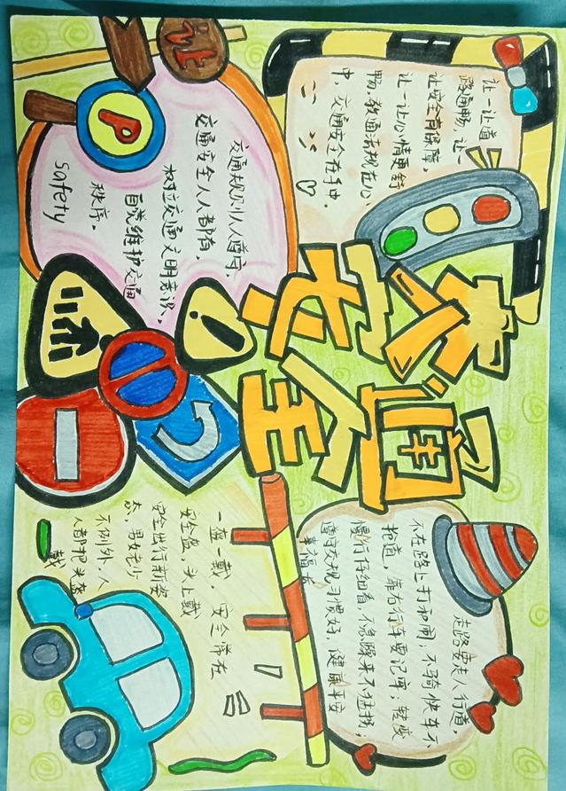 此次活動吸引了學生的積極參與,他們利用課余時間搜集資料,精心設計手抄報內容。同學們的作品不僅版面設計精美,而且主題多樣,涵蓋了交通信號識別、安全行走規則、騎行和乘車安全等多個方面,充分展示了學生們對交通安全重要性的認識和理解。活動參與者用手中的筆繪出生動的圖畫、寫下有力的文字,呼吁大家學習交通法規,并將其應用到日常生活中,共同營造一個安全、和諧的校園環境。