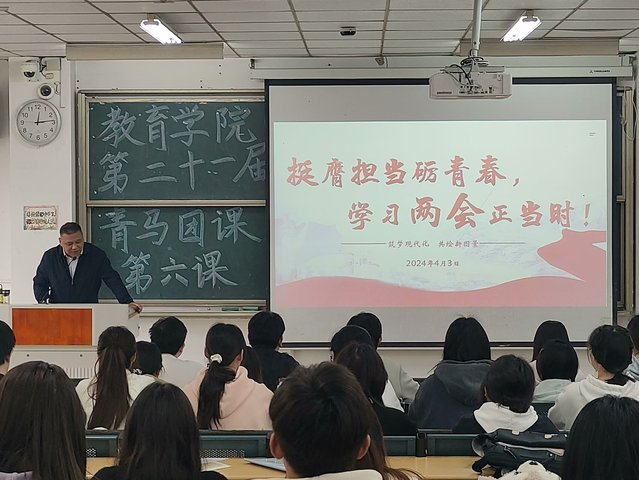 為了加強團員青年對于兩會精神的學習與貫徹,加強團員青年們的思想政治教育,提升團員青年們的思想理論水平和政治素養,豐富學生精神世界,提升思想境界。4月3日中午12點10分,合肥大學教育學院第二十一屆青馬團課第六課在三棟101教室順利進行,組織部部長朱思宇擔任主持人。