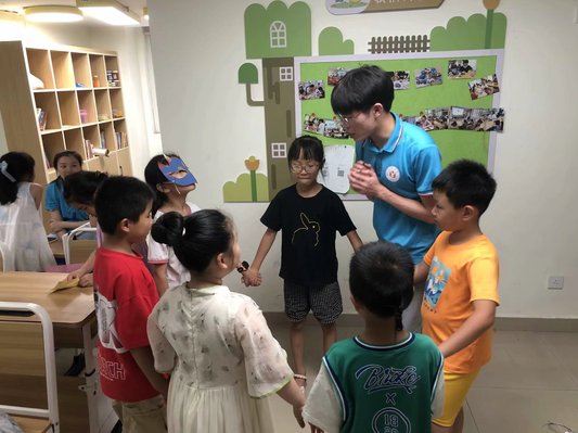 7月12日下午,合肥學院教育學院“七彩童年,‘育’你相伴”志愿團隊前往合肥市包河區濱湖和園社區開展“三下鄉”社會實踐活動。本次三下鄉活動接近尾聲,別離前的最后一堂課,志愿者田鑫為孩子們帶來了一堂團體心理輔導課程,帶領他們感悟人生價值所在。 心似雙絲網,中有千千結,開啟課程的熱身活動即為“心有千千結”。游戲開始,所有的孩子們手拉手圍成一個圓圈,志愿者叮囑孩子們一定要記住與自己左右手相握的人。經過這段時間的相處,孩子們對彼此的名字早已熟稔于心。隨后,孩子們隨著音樂自由律動著,音樂一停,腳步即停。孩子們按照志愿者的引導,準確地找到彼此的手,相互緊握,交錯形成了一個錯綜復雜的“手鏈”。志愿者要求大家在不松手的情況下,用各種方法,如跨、鉆、套、轉等,將交錯的“手鏈”解成一個大圓圈。因為孩子們第一次接觸這個游戲,所以都不太相信最終可以解開。志愿者鼓勵孩子們多多嘗試,相信自己,也相信同伴。在孩子們的一番努力下,“手鏈”解開了,“心結”也解開了。游戲的過程就像孩子們在這十天的相處中,或許有過嫌隙,但隨著游戲的開展,不愉快都漸漸消失,留下的只有美好的回憶。