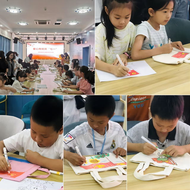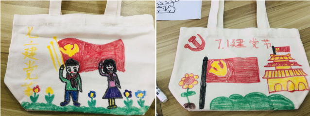 最后一個環節是手工繪制帆布袋,通過紅色故事和紅色歌曲,小朋友可以在帆布袋上繪制他們想象的畫面,學生黨員積極協助小朋友完成紅色主題的繪畫,鮮艷的黨旗飄揚在一幅幅帆布袋上?;顒幼詈?,支部黨員與小朋友們一起合影留念。