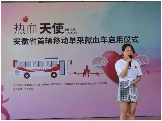 521日,熱血天使系列活動暨安徽省首輛移動單采獻(xiàn)血車啟動儀式在合肥學(xué)院正式開幕。出席本次啟動儀式的領(lǐng)導(dǎo)有安徽省血液管理中心主任范文安、合肥學(xué)院團(tuán)委書記杜鵑、安徽省血液中心/合肥市中心血站業(yè)務(wù)主管龐霄、熱血天使代言人張奧等。