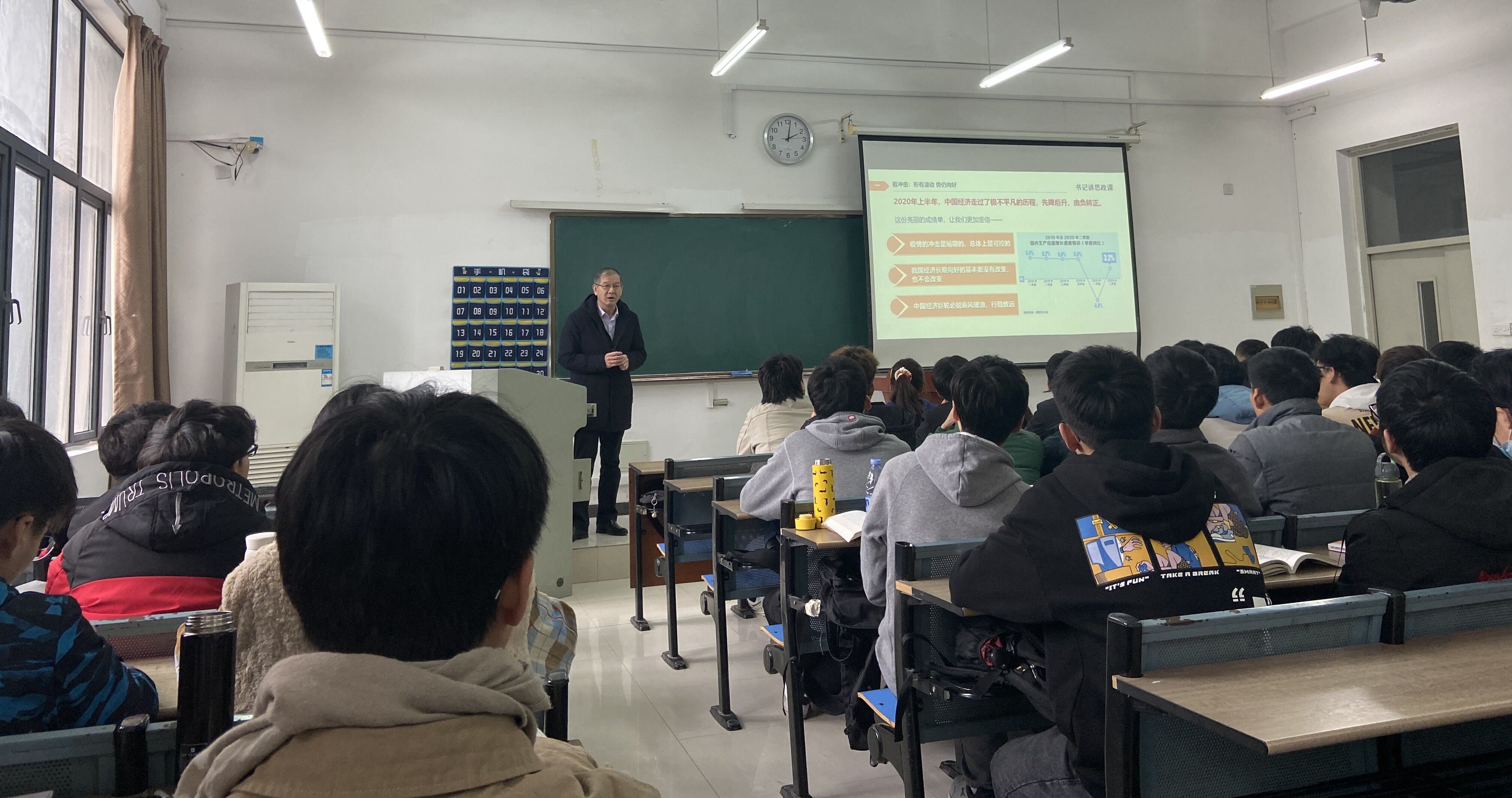 在授課中,王其東以深厚的學識、開闊的眼界、生動的例證,分析了當前中國經濟發展的特點和趨勢,深度解讀了當前我國的經濟形勢。他指出,2020年上半年盡管受新冠肺炎疫情的沖擊,但是我國經濟在一系列政策作用下,走出了先降后升、穩步復蘇的曲線。我們要用全面、辯證、長遠的眼光看待當前經濟形勢,充分認識到疫情對我國經濟的沖擊是短暫的、經濟形勢總體上是可控的,中國經濟穩中向好、長期向好的基本面沒有改變,潛力足、韌性強、回旋空間大、政策工具多的基本特點沒有改變。他表示,只要扎實做好“六穩”工作,全面落實“六保”任務,在危機中育新機、于變局中開新局,不斷培育壯大經濟新增長點、增長極,中國經濟的巨輪必能乘風破浪、行穩致遠。 “你們能源化學專業在電池領域開發與制造方面大有可為”,“當前我們學校的一項重點工作就是推進2021屆學生的就業問題”……王其東緊密結合學生專業和感興趣的實際問題,暢談當前中國經濟發展的廣闊前景。他鼓勵學生們勤學、修德、明辨、篤實,積極提升自身能力和素質,做對社會有用的人,做有大格局的人。