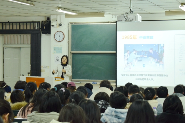 本次授課分為兩個主題。在“合肥市情簡介”主題授課中,吳春梅向同學們介紹了合肥市發展歷程和改革成效,她列舉了大量名人事例,生動形象地描述了合肥市優秀的區位條件、豐富的科教資源、鮮明的產業特色以及對人才和創新的高度重視,同時她還介紹了學校四十年來蓬勃發展的歷程,以及對德合作取得的重要成績,與同學們分享了學校未來的發展規劃。