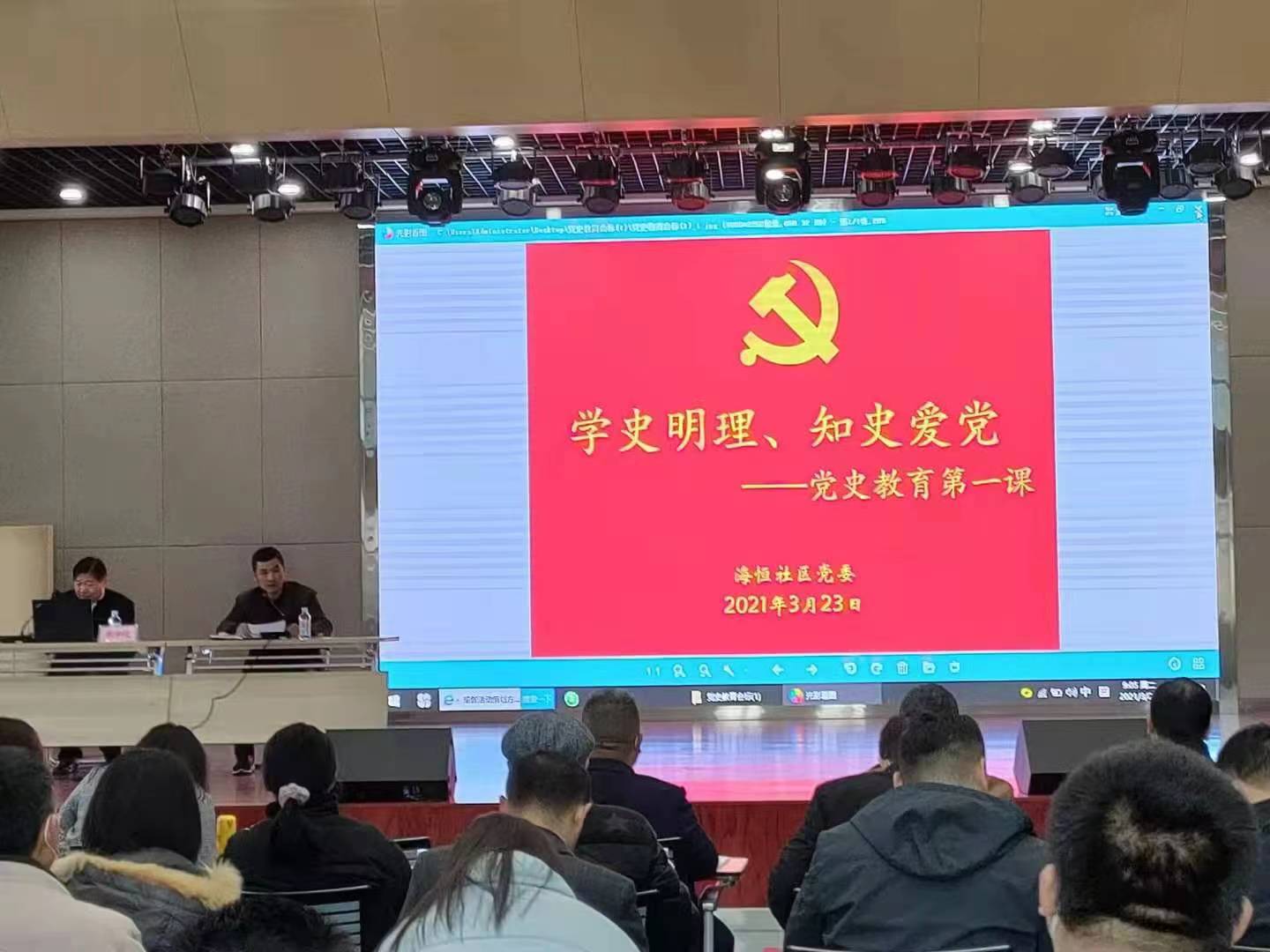 為深入學習貫徹習近平總書記在黨史學習教育動員大會上的重要講話精神,323日上午,經開區海恒社區黨委組織開展黨史學習教育“第一課”,掀起黨史學習教育的熱潮。社區機關支部黨員、各級黨組織書記、黨務、入黨積極分子和發展對象等近100人參加了此次培訓。