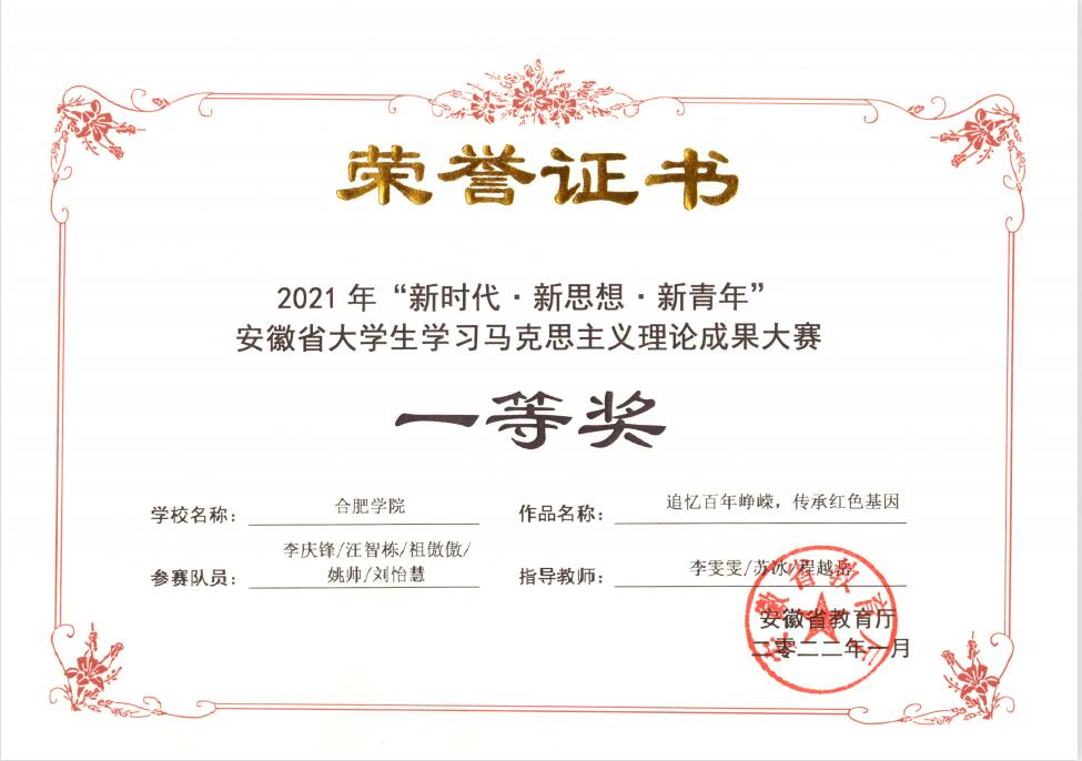 2021合肥學(xué)院-李慶鋒、汪智棟、祖傲傲、姚帥、劉怡慧-微創(chuàng)作《追憶百年崢嶸,傳承紅色基因》省級一等獎