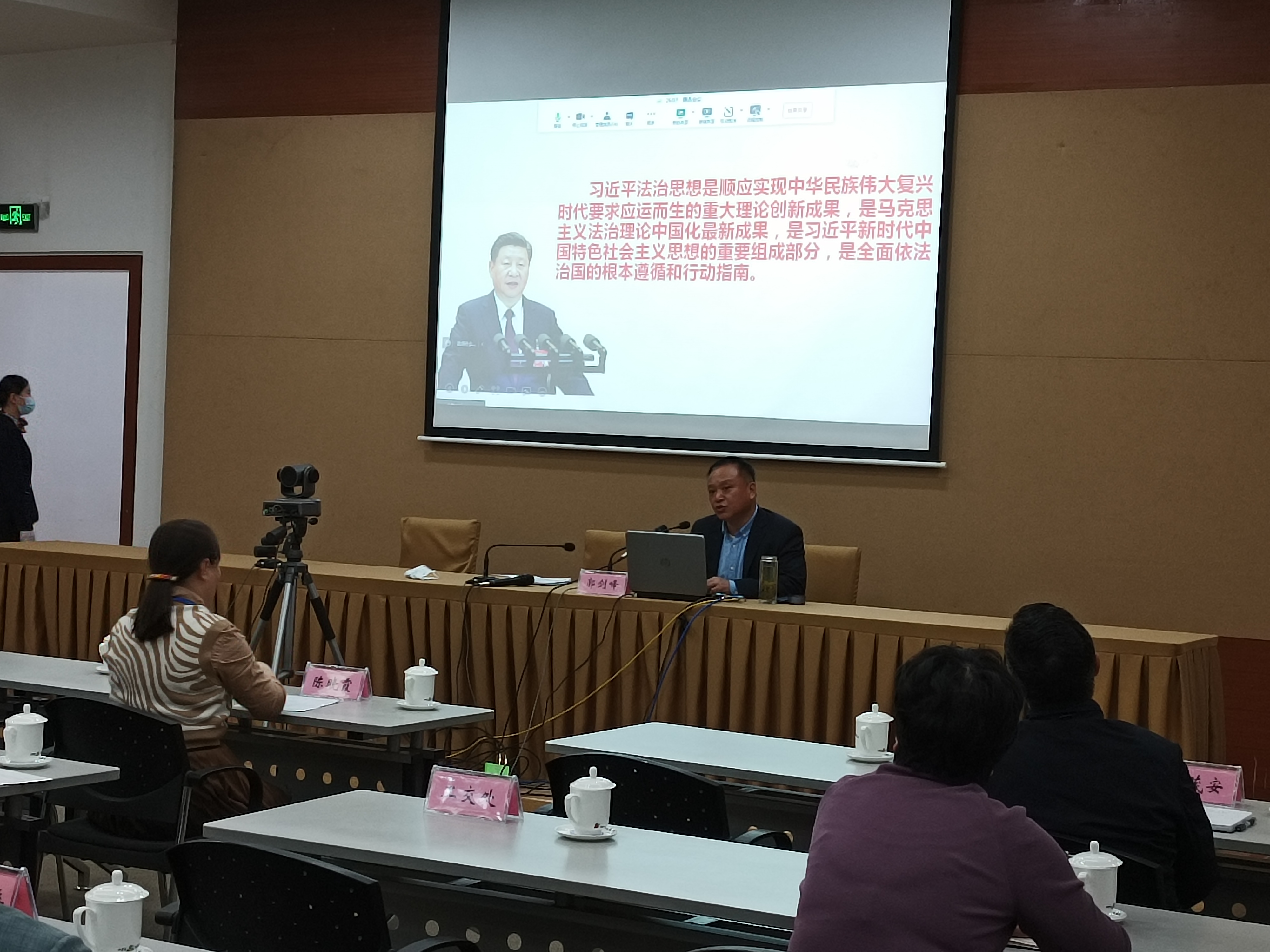 郭劍峰以《學(xué)習(xí)貫徹習(xí)近平法治思想、開啟全面依法治國建設(shè)新征程》為題,回顧了習(xí)近平法治思想的形成和發(fā)展歷程,系統(tǒng)闡述習(xí)近平法治思想的核心要義,論述習(xí)近平法治思想的科學(xué)方法,講述堅持習(xí)近平法治思想指導(dǎo)地位的重大意義。