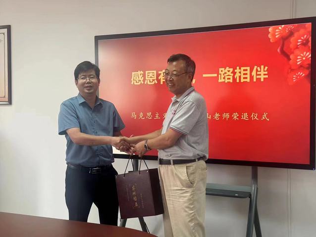 為增強退休教師的成就感、幸福感和榮譽感,充分體現對退休教師的關懷,進一步激發全院教師愛崗敬業、恪盡職守的熱情,8月30日下午,馬克思主義學院全體教師齊聚一堂,在會議室舉行姜從山老師的榮休儀式。馬克思主義學院院長陳志超、馬克思主義學院副院長蘇冰及學院全體教師參加,儀式由副院長蘇冰主持。