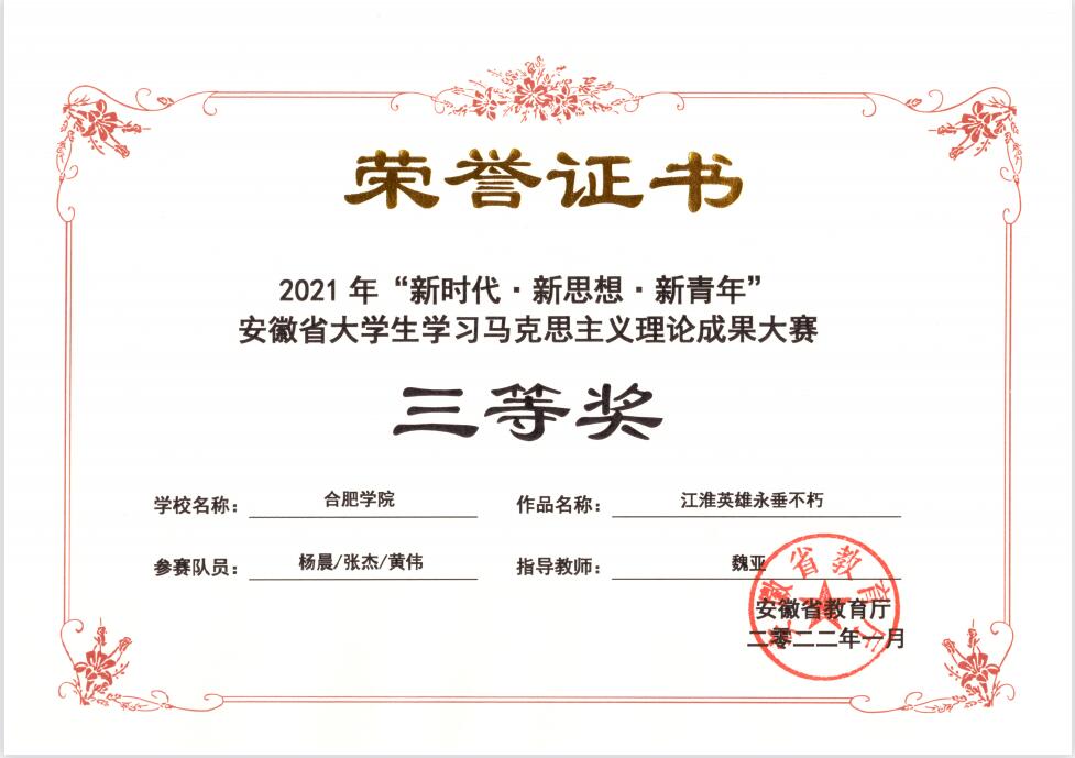 近日,2021年“新時代?新思想?新青年”安徽省大學生學習馬克思主義理論成果大賽評審結果在安徽省教育廳網站公布。我校選送的5件作品有2件獲獎,其中一等獎1項、三等獎1項,這是我校在此賽事中首次實現榮獲一等獎的突破。三位教師獲優秀指導教師獎。