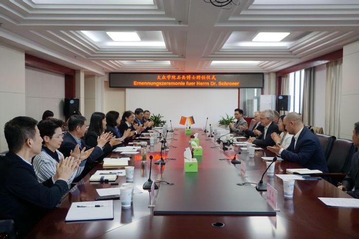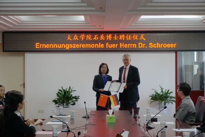 10月8日上午,學校舉行特聘教授聘任儀式,全職聘請大眾集團前高管、工程師石岳博士(Dr. Klaus Schr?er)為大眾學院特聘教授。院長吳春梅,組織部部長白義香,教務處處長、大眾學院院長王曉峰,人事處處長紀平,國際交流合作處處長張慧,大眾學院直屬黨支部書記宣躍文,先進制造工程學院院長胡學友及相關教師出席。大眾安徽首席制造官施耐德博士(Harry Schneider),大眾安徽效率管理總監朱江萍,大眾安徽維修部總監亨德里克·迪普(Hendrik Dippe)受邀出席。儀式由副院長陳秀主持。