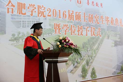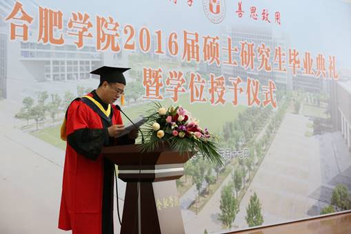 畢業典禮在莊嚴的國歌聲中開始。合肥學院碩士研究生學位評定委員會委員、校黨委副書記丁明教授首先宣讀了合肥學院碩士研究生學位評定委員會“關于授予2016屆環境工程專業徐芳麗等29名研究生工程碩士學位的決定”和 “關于表彰合肥學院2016屆環境工程專業碩士研究生科研成果獎、優秀畢業生、優秀畢業論文和‘合大環保獎學金’獲得者的決定”。