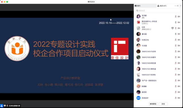 109日晚八時,合肥學院設計學院產品設計專業與壹佳設計共同開展了產品設計課題專題研討會。壹家設計的創始人及總經理李宗會蒞臨會議講學。設計學院黨委書記魯先瑾、教學副院長潘峰、產品教研室主任石林等老師,以及19級產品設計專業學生參加了本次設計課題的線上研討會。