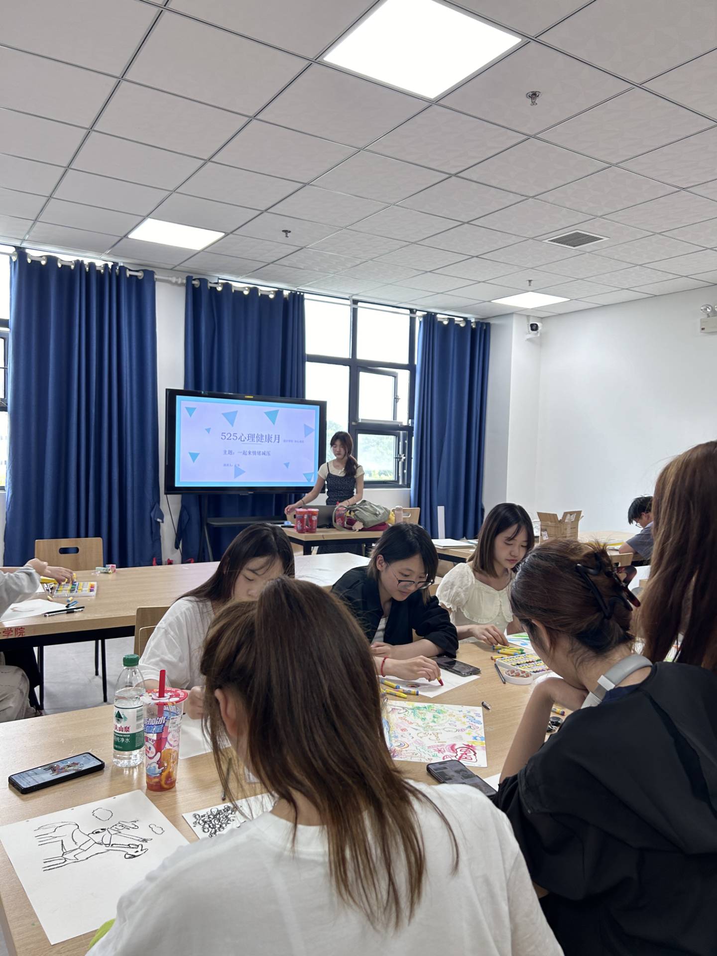 本次活動旨在通過繪畫,幫助學生放松身心,緩解壓力。活動伊始,由王樂同學介紹了本次活動流程。她向同學們認真介紹,一是參與者選擇適合自己的繪畫方式。比如水彩、油畫、素描等等讓自己更加享受繪畫的過程。二是放松身心。在繪畫之前,可以先進行一些放松的活動,比如深呼吸、冥想等等,讓自己的身心得到放松。三是自由創作。在繪畫的過程中,不要過于拘泥于細節和技巧,可以自由發揮,隨意創作。這樣可以讓自己更加放松,享受繪畫的樂趣。四是關注當下。在繪畫的過程中,可以專注于當下的感受和體驗,不要過于擔心結果和評價。這樣可以讓自己更加放松,享受繪畫的過程。五是與他人分享。可以將自己的作品與他人分享,這樣可以增加自己的自信心和滿足感,同時也可以獲得他人的鼓勵和支持。活動中,同學們認真繪畫,把壓力具體化、形象化,之后同學們互相交流分享,效果良好。