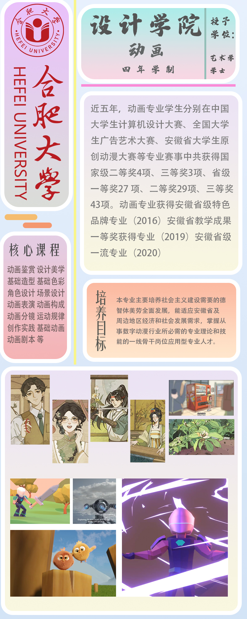 畢業生發展方向:畢業生可在電影、電視、游戲、動漫、廣告、傳媒公司、專業機構從事開發、設計、制作和編導動漫產品及理論研究等相關工作;也可繼續攻讀碩士學位研究生或出國深造。