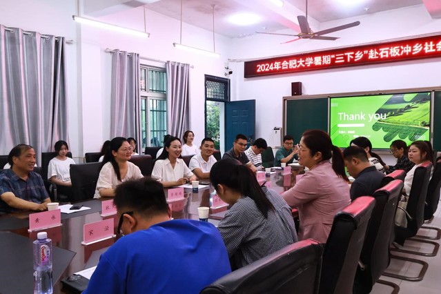 一行人為暑期“三下鄉”活動學生帶來了牛奶等物資并看望慰問了兩戶困境青少年。孩子們收到這些充滿關愛的慰問物資非常開心,表達了深深的謝意。隨后在石板沖鄉初級中學會議室召開2024年合肥大學暑期“三下鄉”赴石板沖鄉社會實踐匯報交流會。