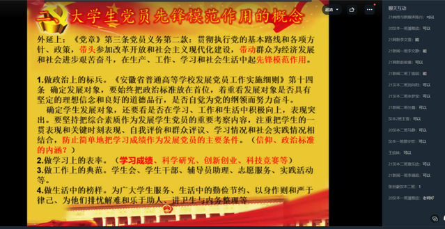 4月25日中午12:30,語言文化與傳媒學(xué)院入黨積極分子培訓(xùn)班第四課線上授課順利開展。本次課程由合肥學(xué)院黨委巡查辦主任丁增云主講,文傳學(xué)院入黨積極分子培訓(xùn)班全體學(xué)員參加。