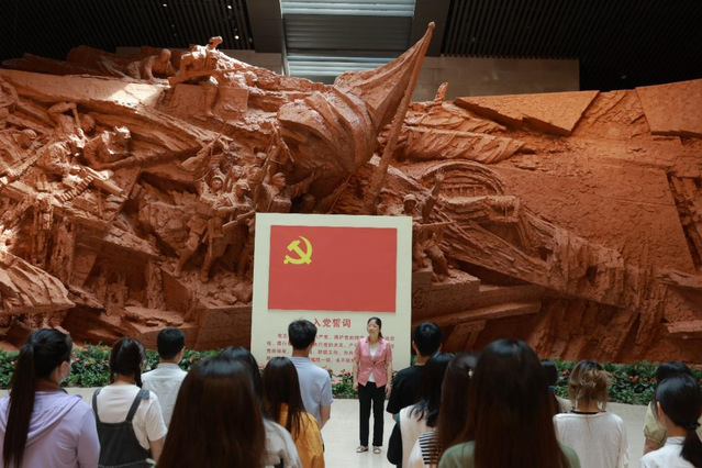 活動(dòng)伊始,在文傳學(xué)院第二黨支部書記柳守志老師的帶領(lǐng)下,支部全體黨員重溫了入黨誓詞,在渡江戰(zhàn)役的巨大浮雕之前,全體黨員們重新加深了對(duì)于誓詞的理解,并更加堅(jiān)定了一心向黨的崇高信念,始終保持絕對(duì)忠誠、維護(hù)核心的政治定力;始終堅(jiān)持人民至上、為民服務(wù)的根本宗旨;始終銘記干在實(shí)處、走在前列的使命擔(dān)當(dāng)。